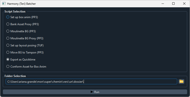 Ce script permet de faire les exports Quicktime d'un ensemble de fichiers harmony.