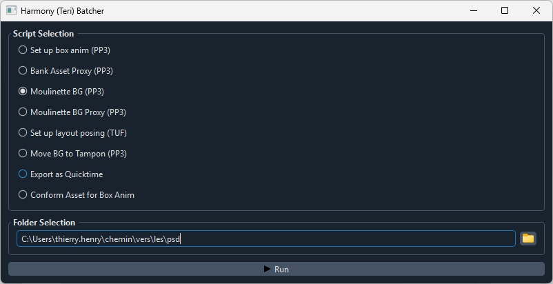 Il suffit de sélectionner Moulinette BG et d'indiquer le chemin du dossier contenant tous les PSD dans le champ correspondant.