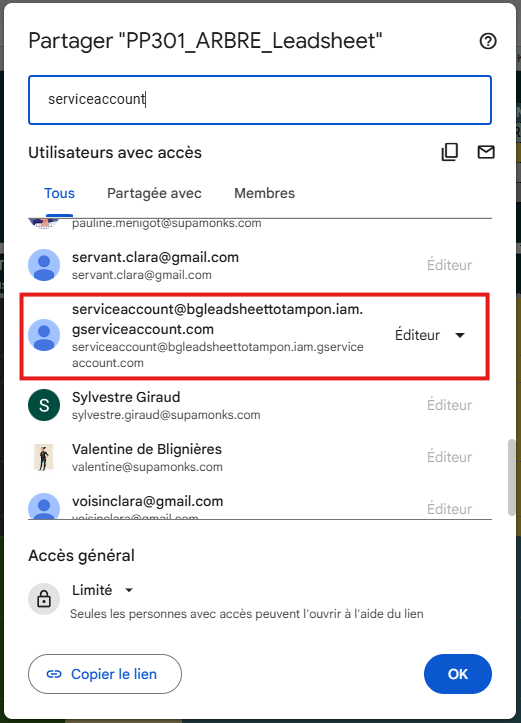 1. Avant de pouvoir utiliser le script, il faut lui donner accès à la leadsheet. Pour ce faire, il faut partager la feuille au compte suivant : serviceaccount@bgleadsheettotampon.iam.gserviceaccount.com